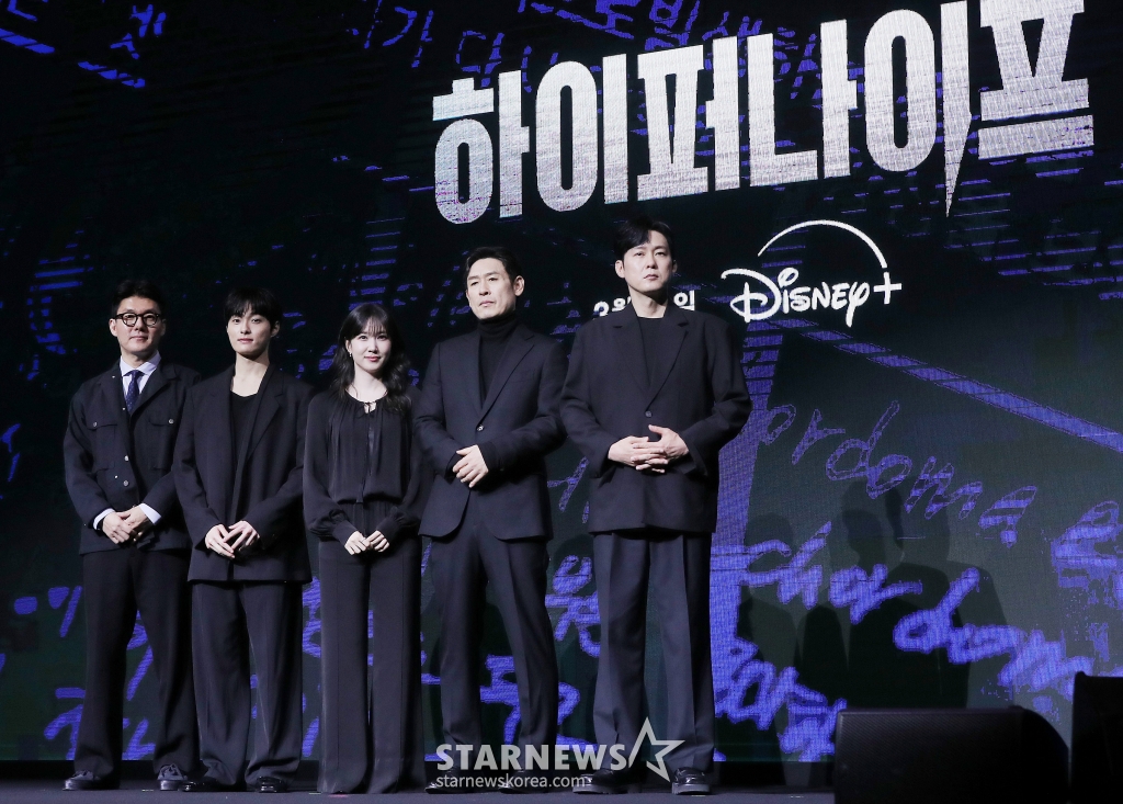 김정현 감독, 배우 윤찬영, 박은빈, 설경구, 박병은이 17일 오전 서울 영등포구 여의도동 콘래드 서울에서 진행된 디즈니+ 오리지널 시리즈 '하이퍼나이프' 제작발표회에 참석해 포즈를 취하고 있다.