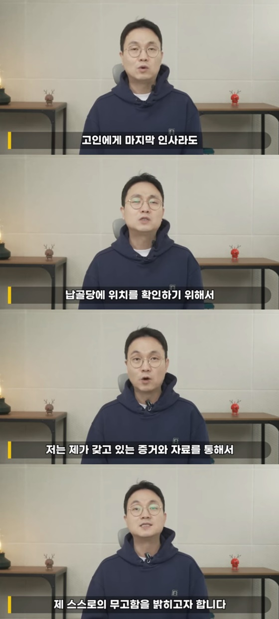 그러면서 "납골당 위치를 확인하기 위해 유가족들에게 전화를 했다'라는 왜곡된 프레임이 쓰여지고 있다"며 "'상 중에 전화를 했다'는 악의적인 프레임이 씌워져 있다. 결코 사실이 아니"라고 강조했다.