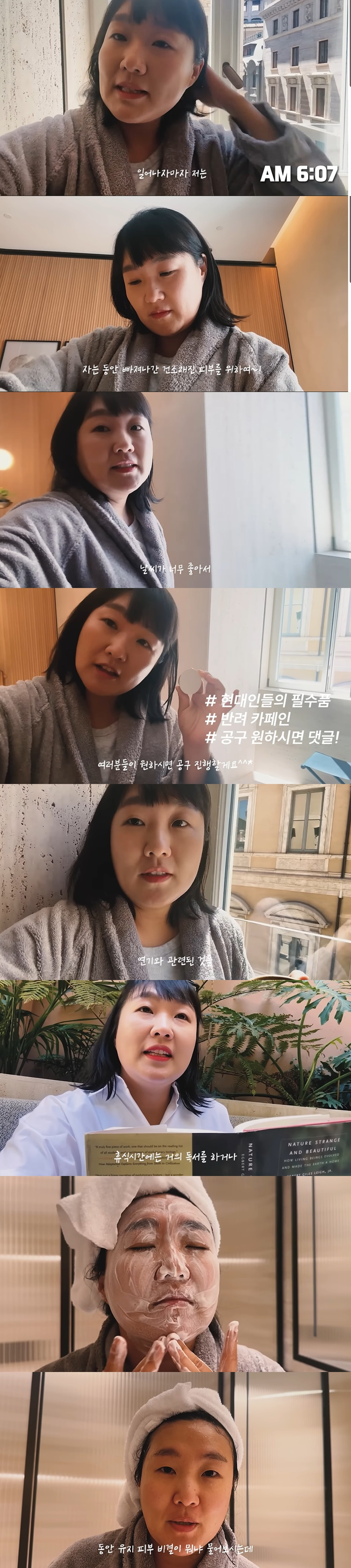 이수지는 모닝커피를 마시는 모습부터 책을 읽고 피부는 관리하는 모습으로 여배우의 일상을 패러디했다.
