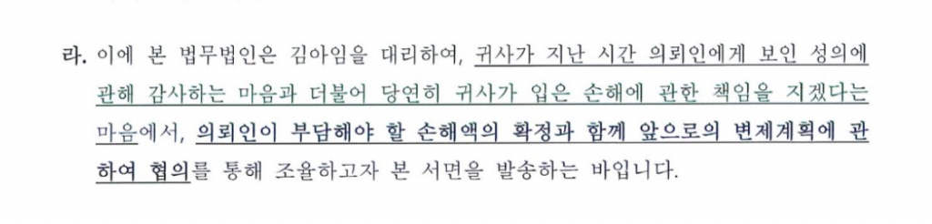 실제로 2차 내용증명을 보낸 다음 날인 3월 26일, 당사의 법률대리인은 당시 김새론 씨의 매니지먼트사와 소통하여 내용증명 우편의 취지를 설명하였습니다. 이에 김새론 씨는 2차 내용증명을 통해 "귀사가 지난 시간 의뢰인에게 보인 성의에 관해 감사하는 마음과 더불어 당연히 귀사가 입은 손해에 관한 책임을 지겠다는 마음에서, 내가 부담해야 할 손해액의 확정과 함께 앞으로의 변제계획에 관하여 협의를 통해 조율하고자 한다"라는 입장을 밝혔습니다.