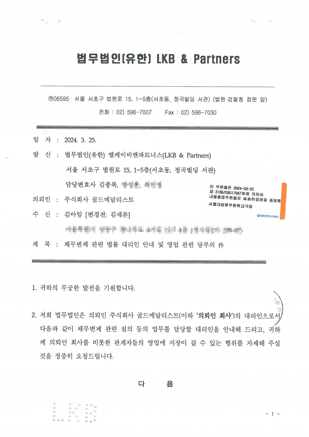[사진 설명 (1)] 골드메달리스트측 법무법인 내용증명 발췌