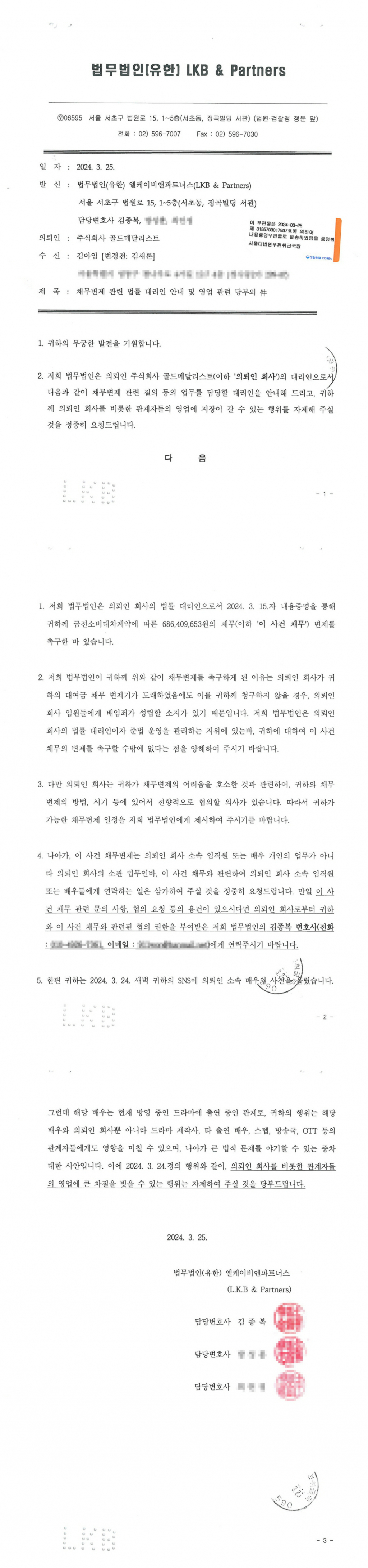 유족 측은 기자회견에서 당사가 2024년 3월 25일 보낸 2차 내용증명에 대해 "내용증명에는 향후 SNS에 (3월 24일에 올린 것과) 유사한 사진을 올리거나, 소속사 배우 중 누구와도 접촉하거나, '눈물의 여왕'이 손해를 보면 전액을 배상 처리하도록 하겠다는 내용이 쓰여 있었다"고 주장했습니다. 이에 내용증명 원문을 이 입장문에 첨부합니다.