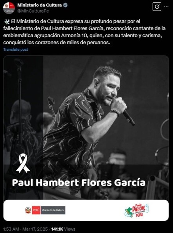 17일(현지 시각) AFP 통신에 따르면 페루의 수도 리마에 30일 동안 비상사태가 선포됐다. 이번 조치는 가수 폴 플로레스가 리마 외곽에서 콘서트를 마치고 밴드 동료들과 함께 차를 타고 가다 살인 청부업자에 의해 총격 사망한 후 이뤄졌다.