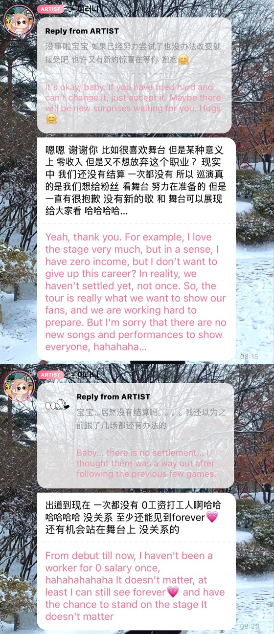 특히 왕이런은 자신을 두고 "데뷔부터 지금까지 급여가 0원짜리인 근로자"라고 표현하기도 했다. 그러면서 "하하하하하하. 적어도 포에버(팬덤명)를 볼 수 있고 무대에 설 기회가 있으니까 상관없다"라고 말했다.
