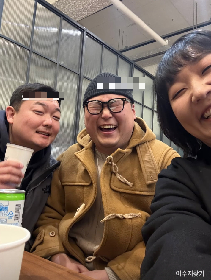 사진에서 이수지는 "이수지찾기"라는 문구와 함께 김요한 김민호와 셀카 타임을 갖고 있다.