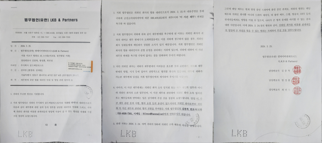 엘케이비앤파트너스 측은 "이 사건 채무 변제는 의뢰인 회사 소속 임직원 또는 배우 개인의 업무가 아니라 의뢰인 회사의 소관 업무"라며 "이 사건 채무와 관련해 의뢰인 회사 소속 임직원 또는 배우들에게 연락하는 일은 삼가해 주실 것을 정중히 요청드린다"고 말했다.