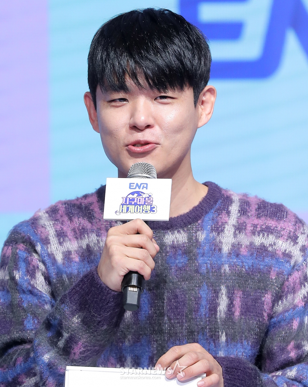 김훈범 PD가 20일 오전 서울 마포구 상암동 쇼킹케이팝센터에서 진행된 ENA 예능 '지구마불 세계여행3' 제작발표회에 참석해 인사말을 하고 있다.
