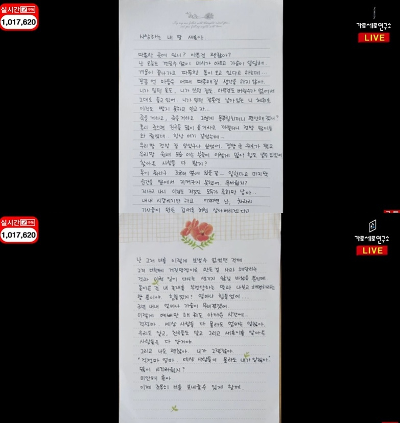 이와 함께 가세연 측은 고 김새론 어머니가 작성했다는 편지를 공개했다. 김새론 모친은 "네가 입던 옷도, 네가 쓰던 짐도, 아무것도 버릴 수가 없어서 그대로 들고 있어. 네가 입던 잠옷엔 남아있는 네 체취로 아직도 빨지 못하고 안고 자.. 죽을 거라고, 죽을 거라고 그렇게 몸부림치더니 편안해졌니?"라고 적었다.