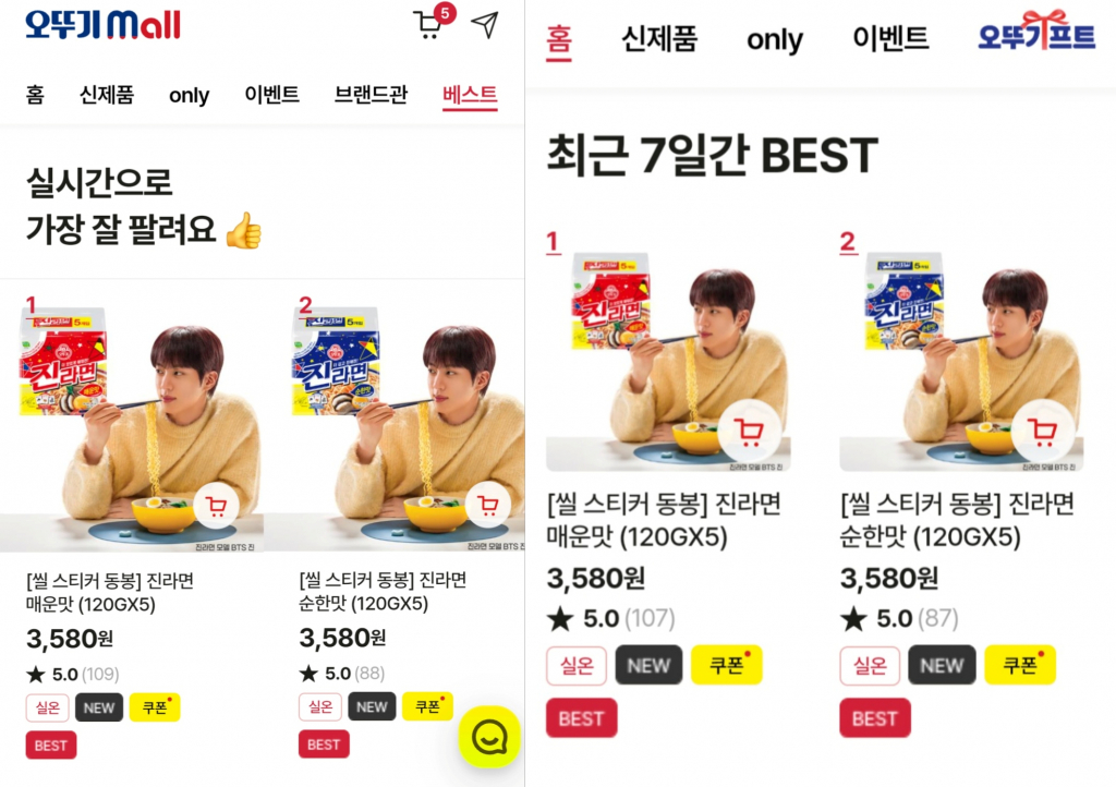 오뚜기몰 실시간 & 최근 7일간 베스트 상품 1위와 2위는 진이 모델인 오뚜기 진라면 매운맛과 순한맛이다. 진의 캠페인 영상이 공개되자마자 계속해서 1위와 2위를 석권하고 있는 것. 진라면은 진의 씰 스티커가 동봉된 소식이 알려지자마자 즉시 품절 사태를 겪으며 팬들의 재입고 문의가 빗발치기도 했다.
