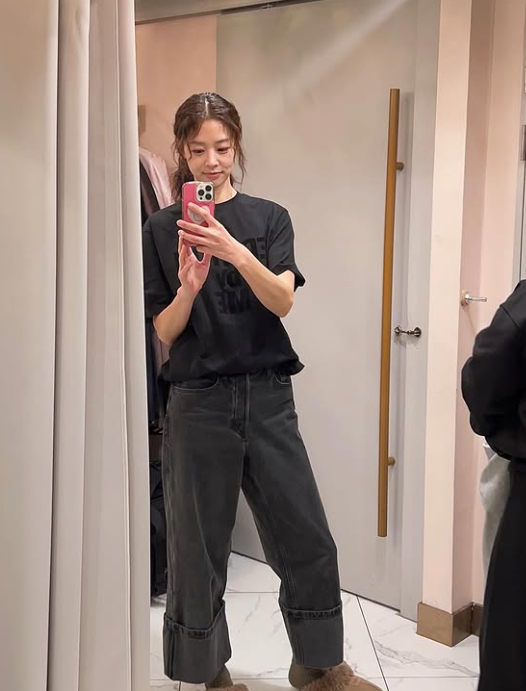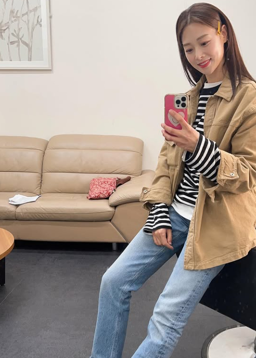 사진 속 장신영은 홀로 일상을 보내며 환하게 웃고 있다.