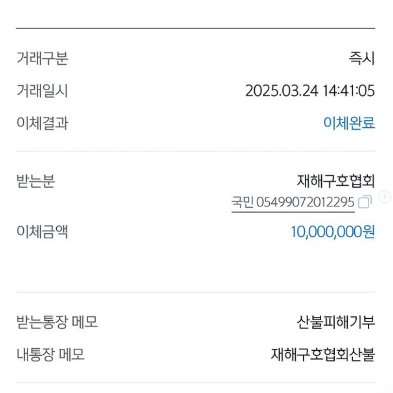 유병재는 통장 메모에 '산불피해기부'라고 적으며 이번 대형 산불에 대한 기부를 했음을 밝혔다.