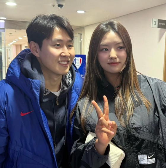 이강인은 환한 웃음을 보이고 있고, 이재아는 수줍은 듯 옅은 미소를 짓고 있다.