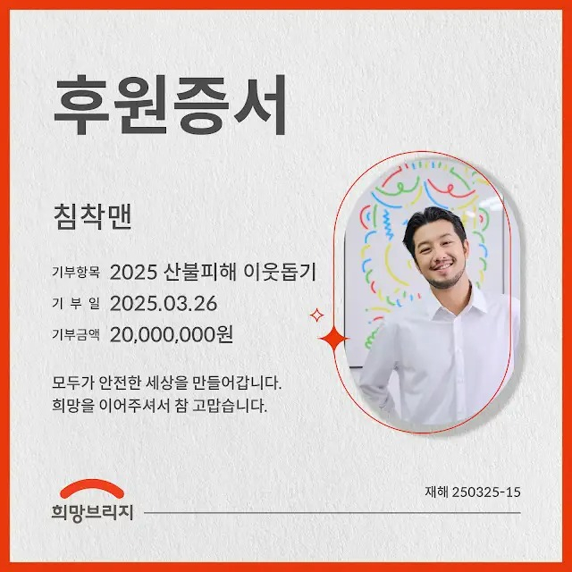 26일 침착맨은 자신이 운영 중인 유튜브 채널 '침착맨'을 통해 이날 희망브리지에 '2025 산불피해 이웃돕기' 항목으로 2천만 원을 기부했다.