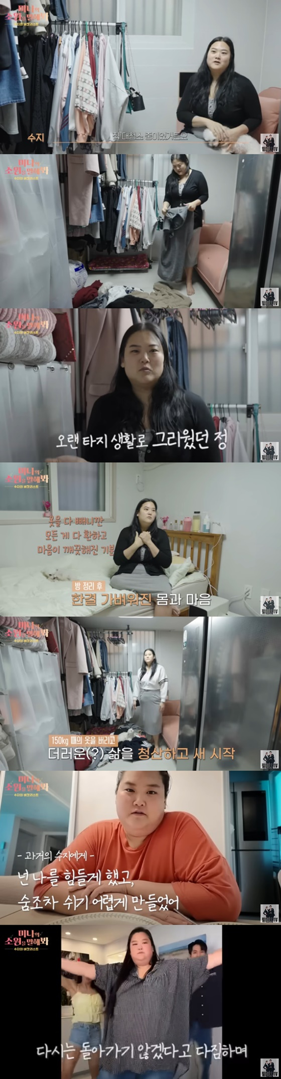 또한 수지는 150kg 당시 입었던 옷을 보여주기도 했다. 그는 "이 옷을 다 버려버리고, 더러운 삶을 청산할 것"이라고 말했다.