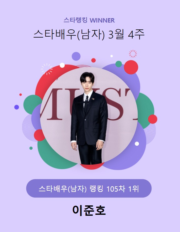 이준호는 지난 20일 오후 3시 1분부터 27일 오후 3시까지 진행된 3월 4주(105차) 스타랭킹 스타배우 남자 랭킹 투표에서 3만 5677표로 1위를 기록했다.