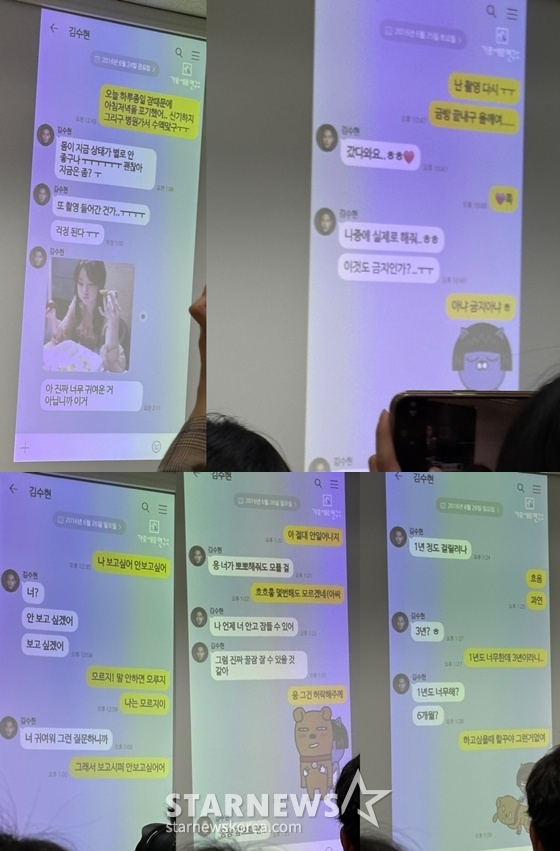 뒤이어 부 변호사는 "김새론이 17세(연나이) 때 김수현과 주고받은 카톡을 재구성해 보여드린다"라며 김새론과 김수현 이름이 적힌 카톡 대화 내용을 공개했다.
