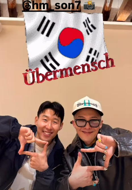 27일 오후 지드래곤은 개인 SNS에 "Ubermensch"라는 글과 함께 손흥민과 찍은 셀카 한 장을 게재했다.
