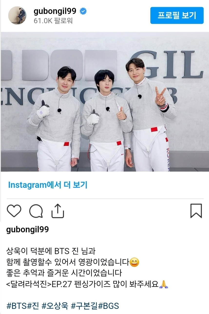 2012년 런던, 2020년 도쿄, 2023 파리에서 모두 금메달을 딴 펜싱 영웅 구본길은 최근 자신의 인스타에 진과 오상욱과 함게 한 사진과 더불어 "상욱이 덕분에 BTS 진 님과 함께 촬영할수 있어서 영광이었습니다. 좋은 추억과 즐거운 시간이었습니다. <달려라석진>EP.27 펜싱가이즈 많이 봐주세요" 라는 글을 업로드했다.