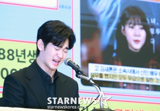 이어 김수현은 "제가 한 선택에 대한 비판은 무엇이든 받겠다. 하지만 제가 하지 않은 일까지 인정할 수는 없다. 유족 측은 증거가 사실이면 경찰에 제출하고 모두 법적인 검증을 받을 것을 요청한다"라며 "이 기자회견이 끝나면, 오늘은 또 어떤 가짜 증거와 가짜 증언으로 제 명예를 훼손하고 괴롭힐지 알 수 없다. 하지만 제가 강요에 못이겨 거짓을 진실이라고 한다면 저는 인간 김수현으로서 뿐만 아니라 스타 김수현에게 믿음과 사랑을 준 모든 분들을 배신하게 된다"라며 눈물을 훔쳤다.