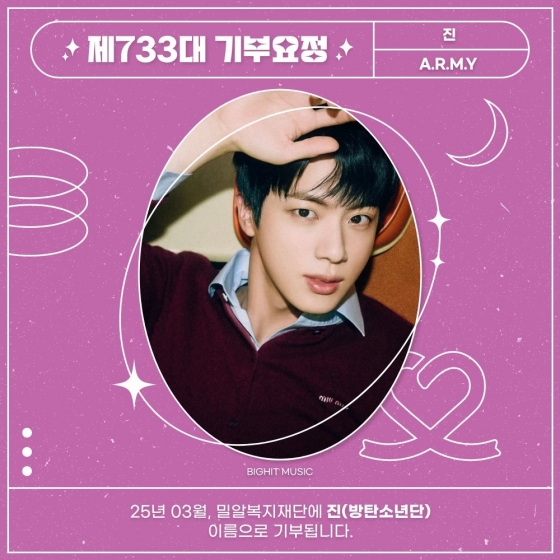 진은 지난해 12월 15일 탄생 11700일을 맞아 기부 요정으로 선정되어 21번째 기부금을 달성했다. 이어 이번이 22번째 기부금 달성으로 총 누적 기부금 1,100만 원을 기록했다. 제733대 기부 요정으로 선정된 진의 이름으로 '밀알복지재단'에 50만 원의 기부금이 전달된다.