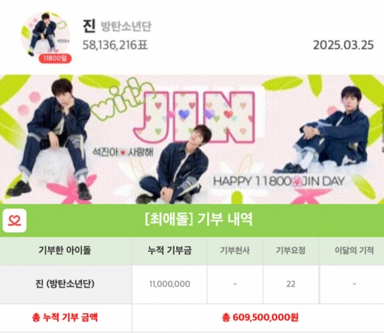 방탄소년단(BTS) 진이 태어난 지 11800일을 맞아 최애돌 기부요정에 등극했다.