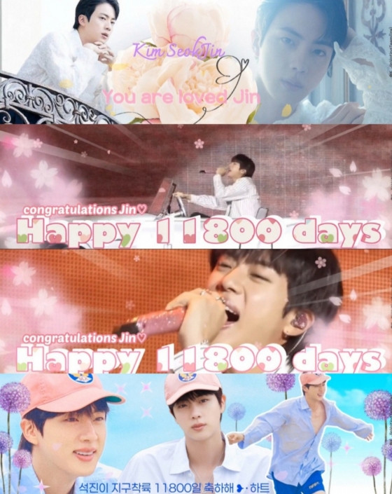 '최애돌' 커뮤니티에 진을 응원하는 근사한 배너를 완성한 팬들은 각종 SNS를 통해 '#11800DaysWithJin', '#석진이_지구착륙_11800일', '#석진탄생11800일축하축하' 등 해시태그로 진을 향한 사랑의 메시지를 남기며 축하했다.