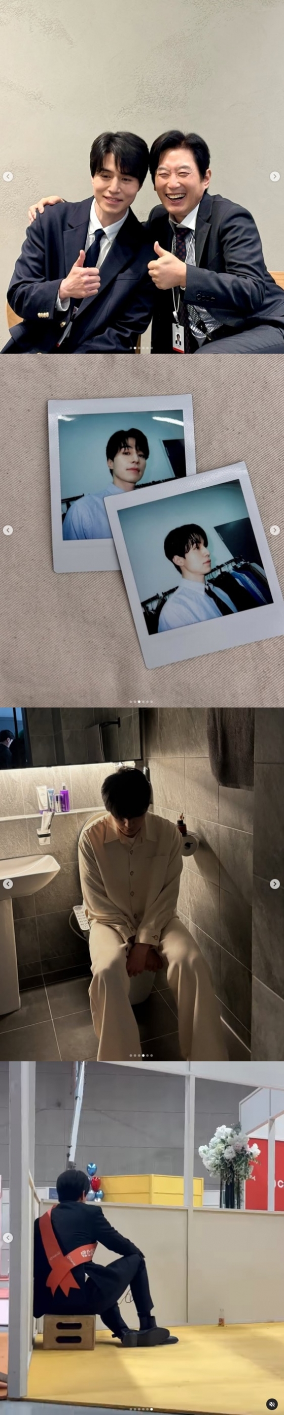 공개된 사진 속에는 tvN 월화드라마 '이혼보험'의 촬영장 모습이 담겨있다. 이동욱은 나대복 역을 연기한 김원해와 함께 엄지를 추켜세우거나 파자마를 입은 채 화장실 변기에 앉아 고개를 숙이고 있는 사진을 게재했다. 또 머리빗을 앞머리에 꽂고 앉아 있는 모습도 담겨있다.