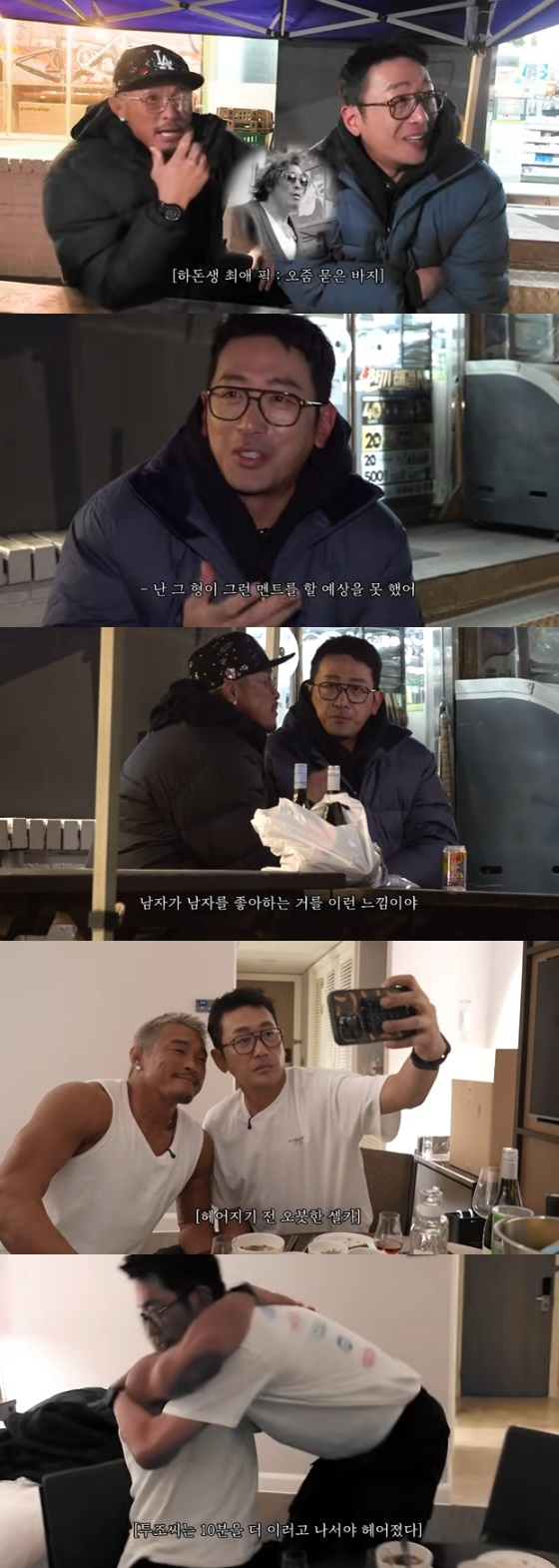 두 사람은 편의점에서 캔맥주를 마시며 대화를 이어갔다. 하정우는 추성훈 채널에서 가장 좋아하는 영상을 묻는 제작진의 질문에 흰 바지에 소변을 묻힌 사실을 솔직하게 공개한 영상을 꼽으며 "그런 멘트를 할 줄 예상하지 못했다. 저도 그런 일이 발생하면 그렇게 얘기하겠다"고 말해 현장을 웃음바다로 만들었다.