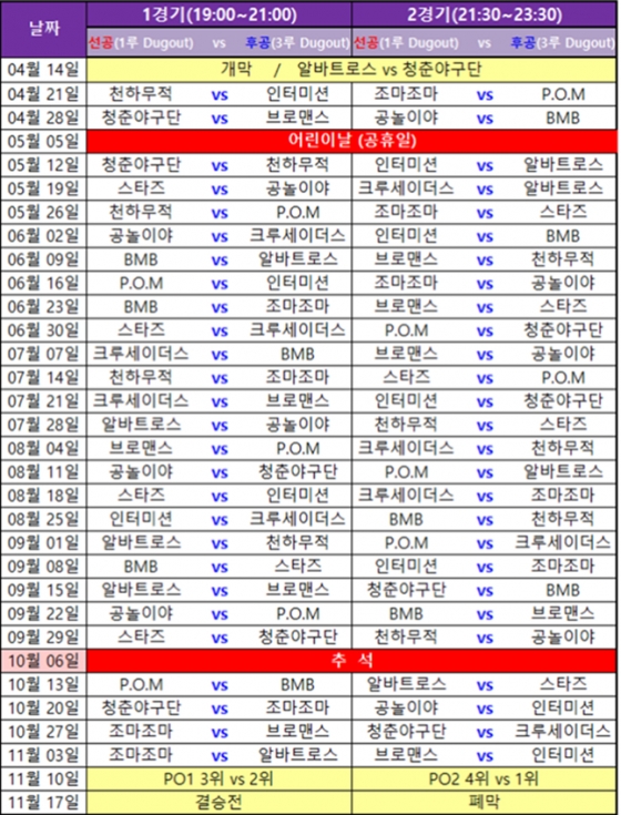 2일 주관사인 (주)한스타미디어에 따르면 이번 리그는 11월 17일까지 프로야구가 없는 매주 월요일에 고양특례시 고양장항야구장(일산동구 장항동)에서 진행된다. 14일 오후 7시 열리는 개막전은 배우 조연우가 이끄는 알바트로스와 '광수생각' 만화가 박광수 감독의 청춘야구단이 맞붙는다.