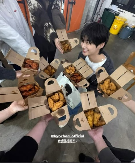 사진 속 변우석은 스태프들이 들고 있는 치킨박스에 둘러싸여 행복한 웃음을 짓고 있었다.
