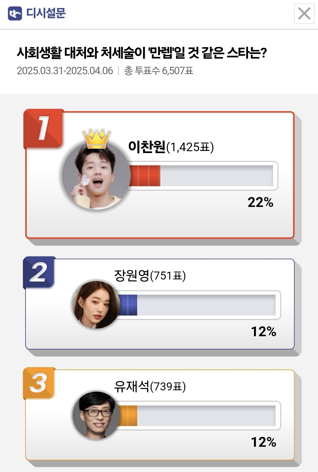 이찬원은 3월 31일부터 4월 6일까지 디시인사이드에서 진행된 '사회생활 대처와 처세술이 '만렙'일 것 같은 스타는?' 설문에서 1위를 차지했다.