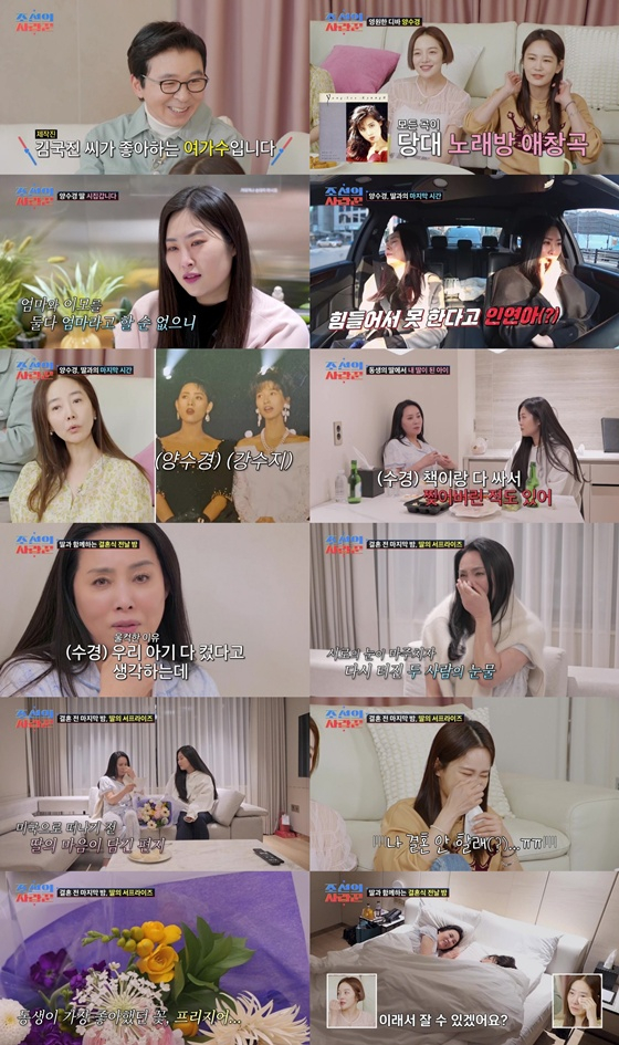 그런가 하면 양수경은 "내 동생은 마지막 전화를 나하고 했다. 고등학교 때부터 채영이처럼, 친구였고 헌신적으로 나를 챙겨주던 동생이었다"라고 먼저 세상을 떠난 여동생을 떠올렸다. 이어 "나는 외로움을 많이 탄다. 동생이 나 외롭지 말라고 채영이를 남겨준 것 같다"라고 털어놨다. 이를 본 최성국은 "옛날에 수경 누나가 '난 잘 안 운다. 평생 울 울음을 예전에 다 울었다'고 말했던 게 생각난다"라고 전해 긴 여운을 안겼다. 이윽고 양수경은 결국 참아왔던 눈물을 터트렸다. 딸과 함께 눈물을 흘리던 그는 "속으로 '우리 아기 이제 다 컸네' 생각했는데, 결혼하면 더 이상 아기가 아니지 않냐"며 울음을 삼켰다. 윤채영은 "맨날 이모가 못 해줬다고 하는데, 사랑도 많이 받았고 덕분에 사람을 사랑하는 법을 알았다"라고 감사를 전해 감동을 자아냈다.