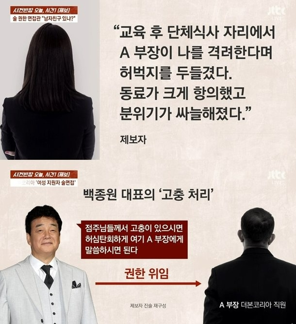 지난 7일 JTBC '사건반장'에 따르면 제보자 A씨는 더본코리아가 운영하는 충남 예산군 '예산상설시장' 2차 점주 모집에 지원해 정식 면접을 보고 결과를 기다리던 중 B부장으로부터 연락을 받고 술자리에 참석했다.