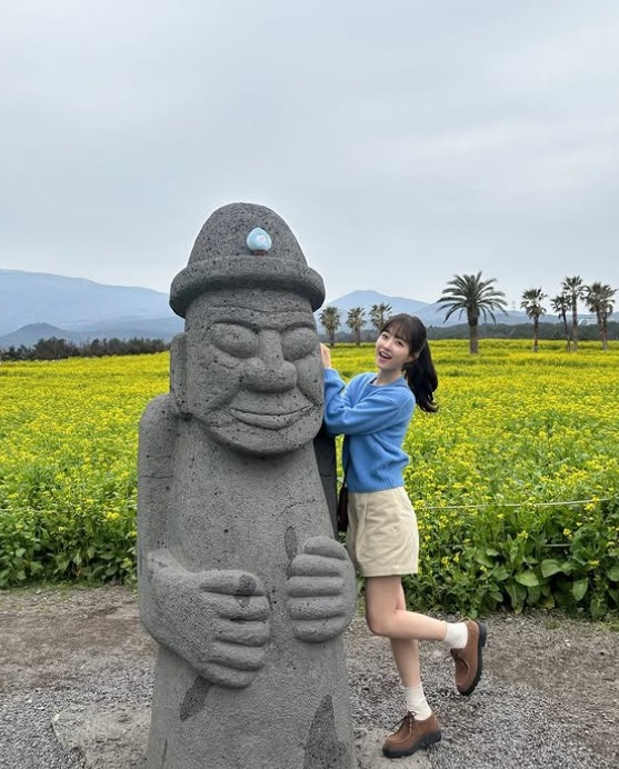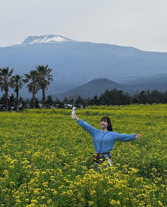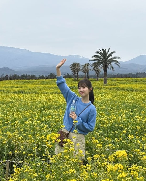 마치 넷플릭스 오리지널 시리즈 '폭싹 속았수다'의 주인공 오애순(아이유 분)을 연상케 하는 배경이 눈길을 끈다. 박보영은 최근 제주삼다수 광고 모델로 발탁돼 유채꽃밭에서 촬영을 진행한 것으로 보인다.