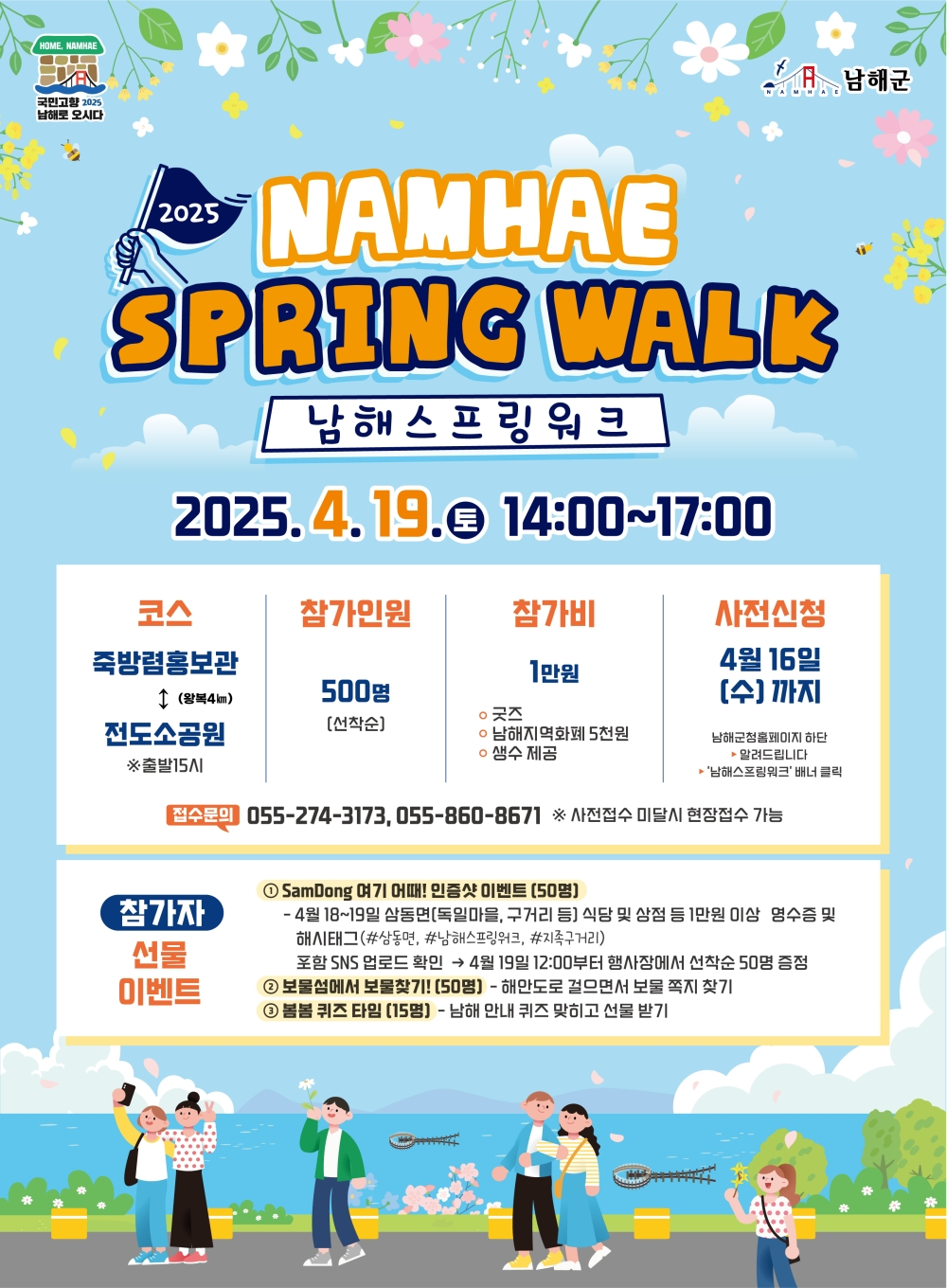 산이 참석하는 '남해 스프링 워크'는 오는 16일까지 남해군 홈페이지를 통해 선착순 500명까지 신청 가능하며, 사전 접수 500명 미달시 현장 접수 가능하다.
