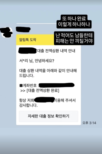 공개된 사진 속에는 '대출 전액 상환 완료'를 알리는 메시지가 담겨 있다. 대출 상환 금액은 가렸다.