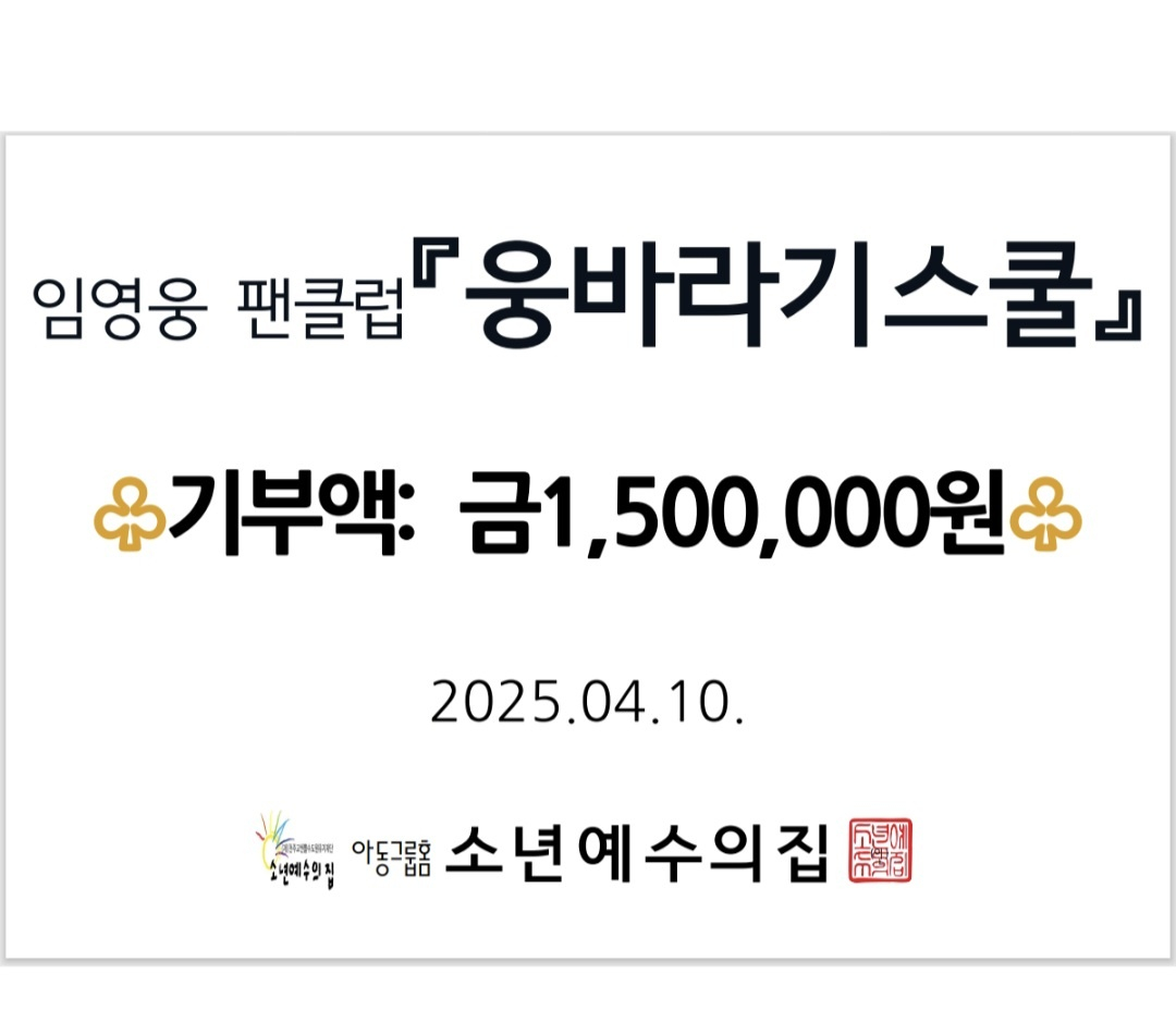 임영웅 팬클럽 '잠실 웅바라기스쿨'은 4월 10일 서울 송파구 아동그룹홈 '소년예수의집'에 16번째 정기후원금 150만 원을 전달했다.