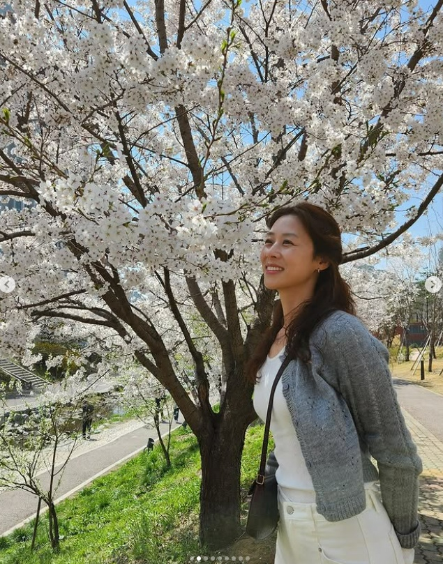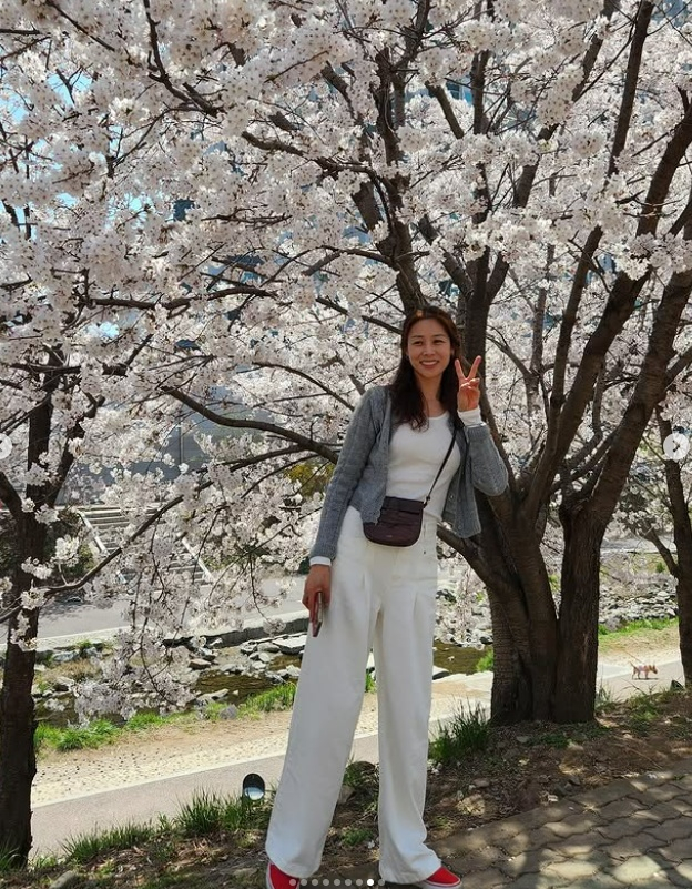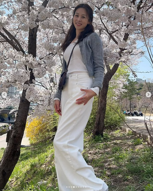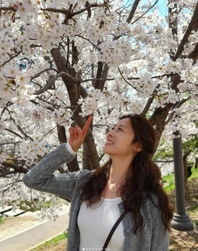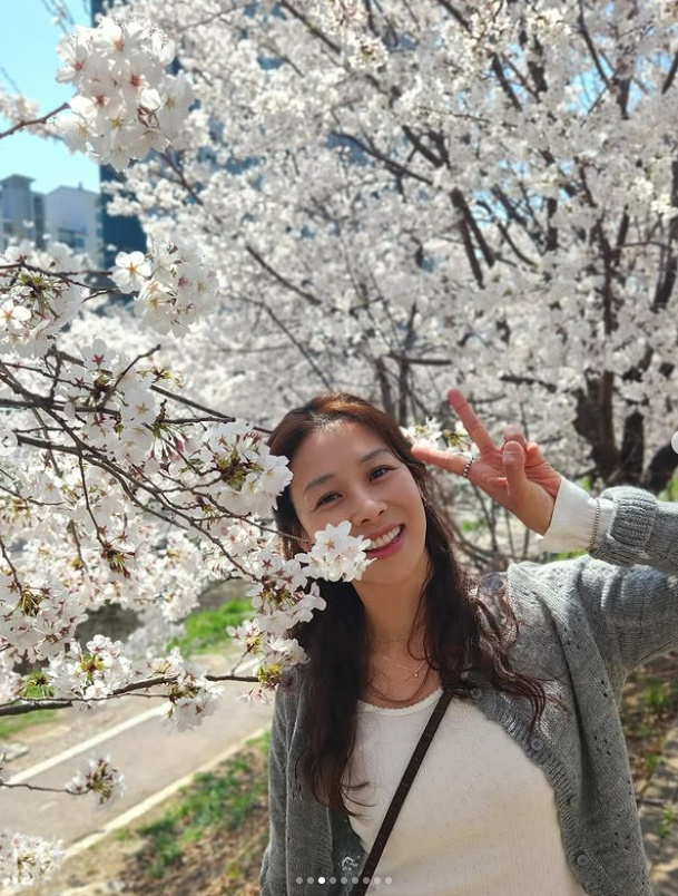 사진 속 장신영은 개천 근처에 만개한 벚꽃나무 아래에서 169cm의 큰 키를 자랑, 여러 포즈를 취하며 환하게 웃었다.