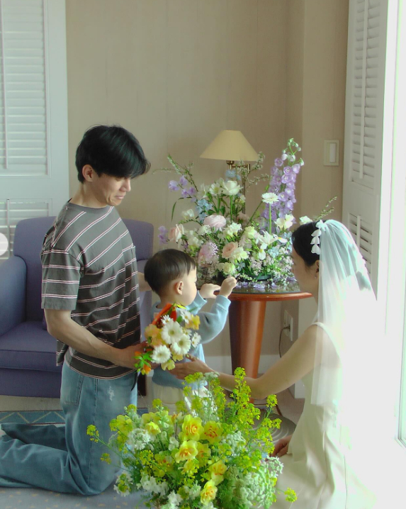 공개된 사진 속에는 제주도에서 결혼 10주년을 기념해 셀프 사진을 찍은 윤승아, 김무열의 모습이 담겼다. 특히 두 사람 사이에는 귀여운 뒷모습의 아들도 함께 있어 훈훈함을 안긴다.
