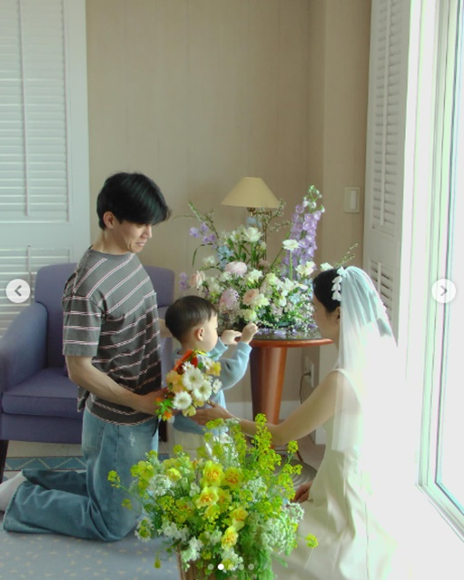 김무열과 윤승아 부부는 결혼 10주년을 맞아 찾은 제주도에서 리마인드 웨딩 사진을 찍은듯한 모습. 면사포를 다시 쓰고 아들과 함께 사진 찍은 윤승아의 모습이 사랑스럽다.