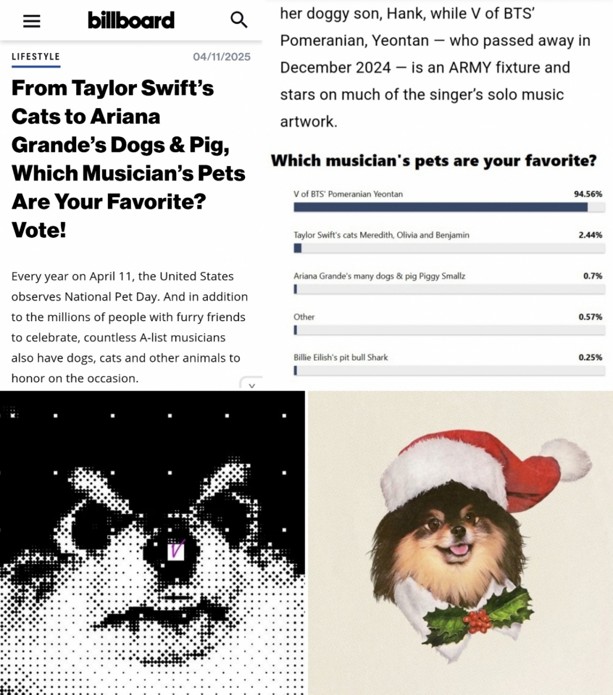 빌보드는 '반려동물의 날'을 기념해 '전 세계 팝스타들의 반려동물 중 가장 좋아하는 동물' 투표를 실시했다. 빌보드는 "유명한 주인들처럼, 많은 유명 반려동물들도 자신만의 팬덤을 가지고 있다. 스타들의 반려동물은 다양한 광고, 뮤직비디오, 화보에도 등장한다"며 테일러 스위프트, 아리아나 그란데, 뷔 등 팝스타들의 반려동물을 소개했다.