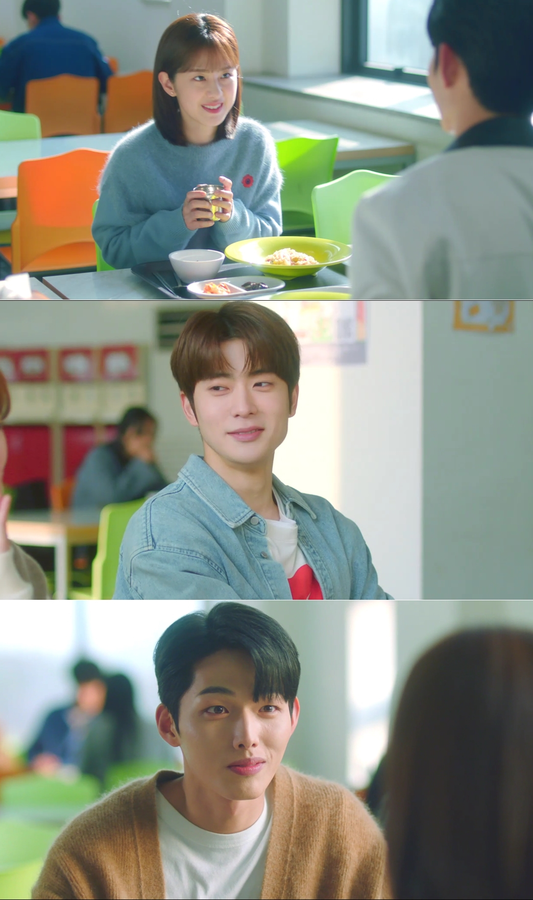마주아는 음식에는 손도 대지 않고 눈 앞의 상대에게 시선을 고정한 채 수줍은 듯 설레는 미소를 짓고 있다. 평소에는 귀여운 장난기로 절친 차민호와 티격태격하기 일쑤지만 짝사랑 앞에서는 한없이 작아지는 순수한 모습이 사랑스럽게 느껴진다.