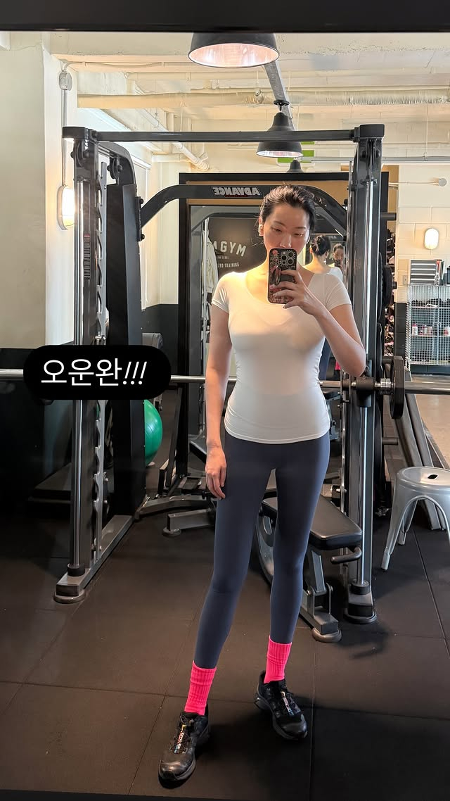 사진 속 장윤주는 네이비 레깅스에 화이트 운동복을 입고 헬스장에서 거울을 바라보고 있는 모습. 자칫 밋밋할 수 있는 운동복에 핑크 양말을 매치하면서 포인트도 잊지 않았다.