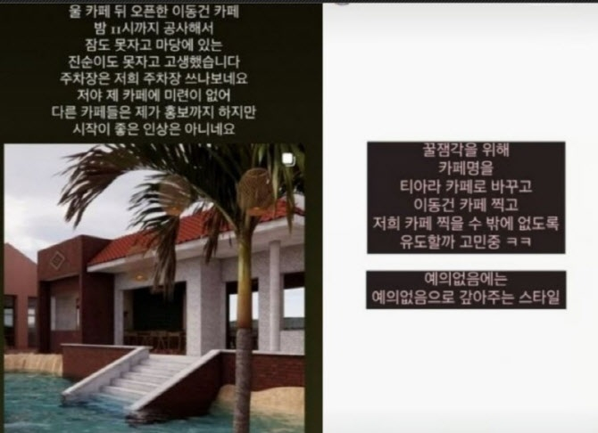 이동건 카페 근처에서 카페를 운영한다는 A 씨는 "우리 카페 뒤에 오픈한 이동건 카페. 밤 11시까지 공사해서 잠도 못 자고 마당에 있는 진순(바려견)이도 못 자고 고생했다"라고 토로했다.