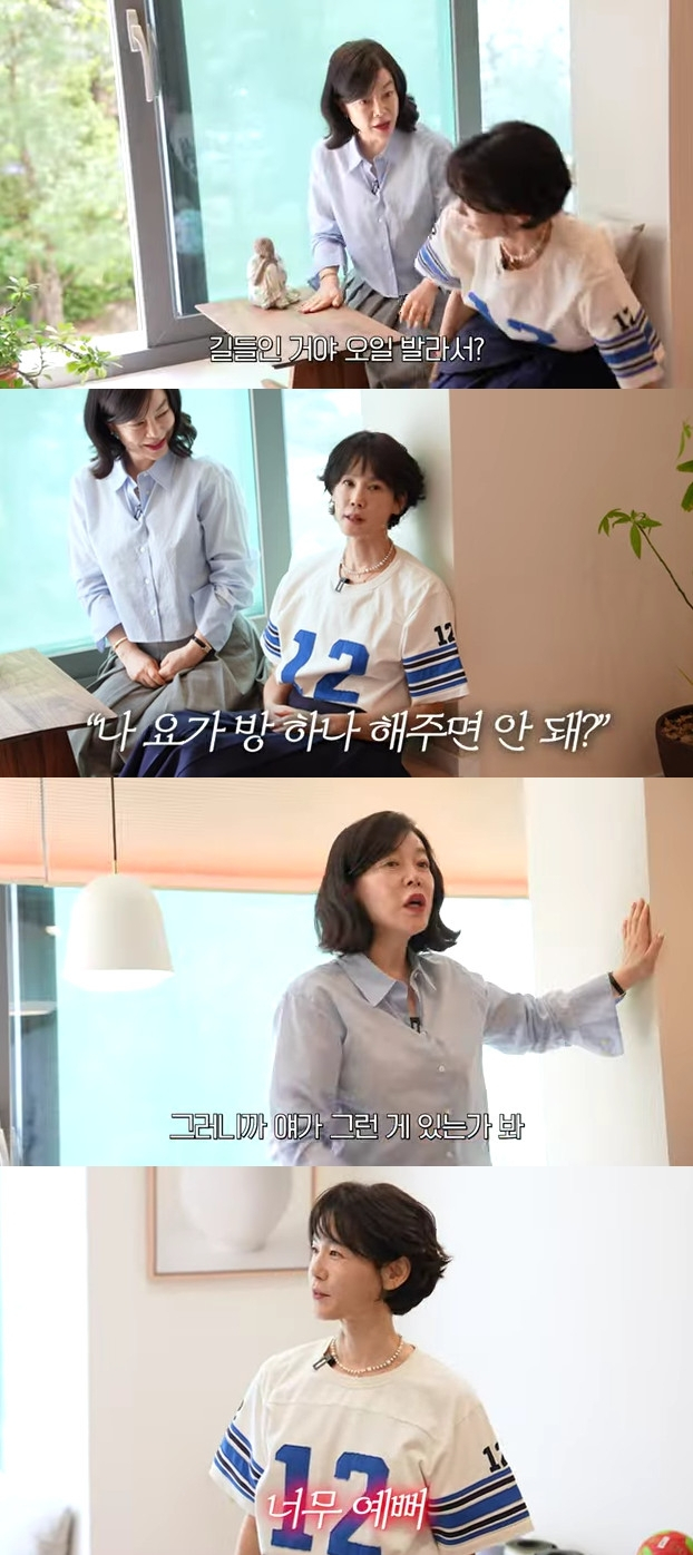 이어 최화정은 집 구경에 나섰고, 요가방에 들어갔다. 김지호는 "맨날 요가 매트 들고 밥 먹는 데서 요가하고, TV 보는 데 옆에서 해서 방 하나 만들어 달라고 했다. 이 방만 마루를 깔았다. 티테이블도 내가 직접 만들었다"고 자랑했다.
