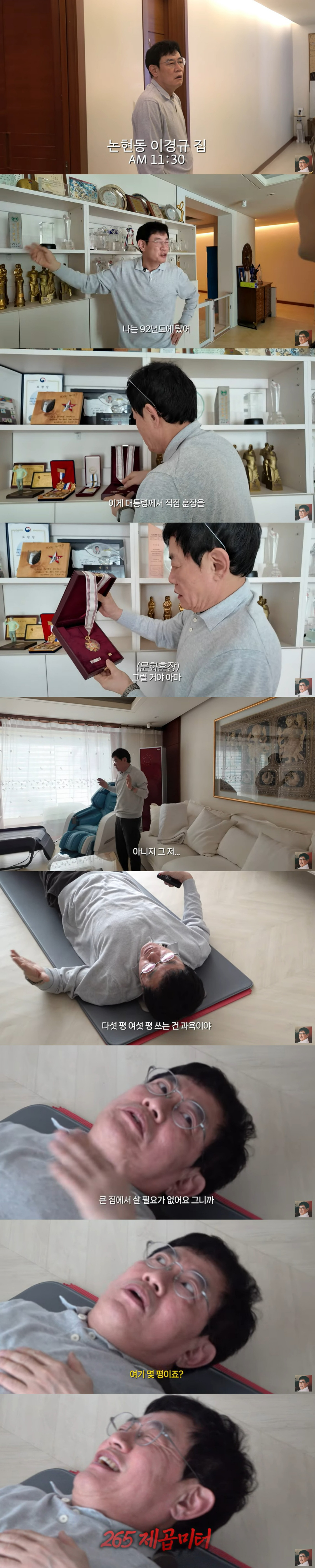 뒤이어 그는 80평 대저택 한 벽면을 꽉 채운 트로피들을 소개했다. 특히 이경규는 "'이경규가 간다-양심 냉장고'를 찍을 때 대통령 훈장을 받았다. 안 받으려 했는데 주는 걸 어떻게 안 받아"라고 너스레를 떨어 웃음을 자아냈다.
