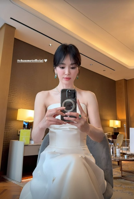 사진 속 송혜교는 오프숄더 화이트 드레스를 입고 자신의 모습을 촬영하고 있었다.