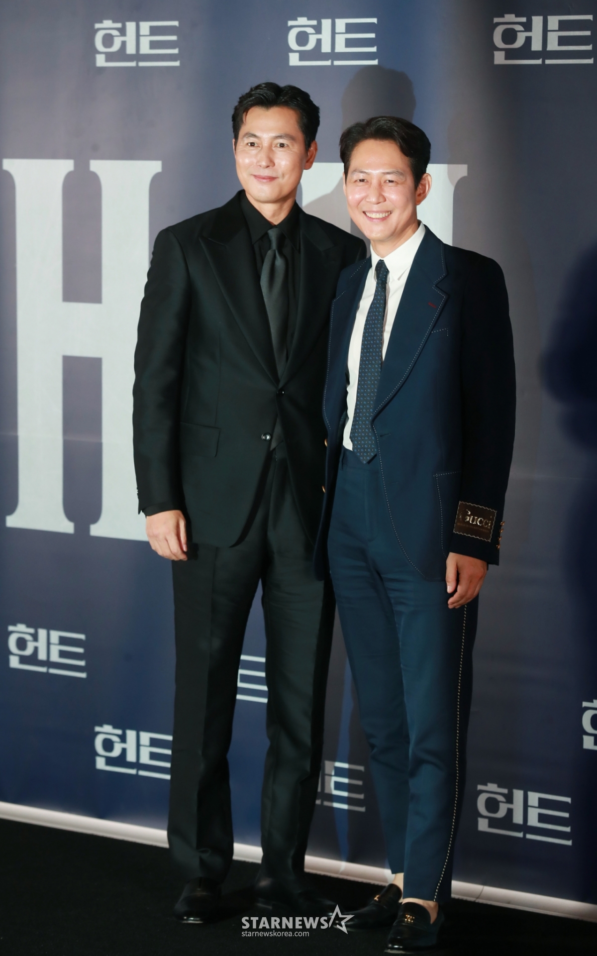 배우 정우성, 이정재가 27일 오후 서울 강남구 메가박스 코엑스점에서 진행된 영화 '헌트'(감독 이정재) 언론시사회에 참석해 포즈를 취하고 있다. 조직 내 숨어든 스파이를 색출하기 위해 서로를 의심하는 안기부 요원 박평호와 김정도의 이야기를 그린 영화 '헌트'는 8월 10일 개봉한다. /2022.07.27