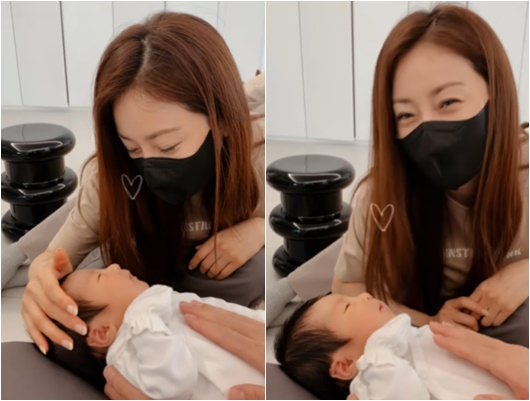 배우 오나라가 신생아를 바라보며 행복한 미소를 지었다.
