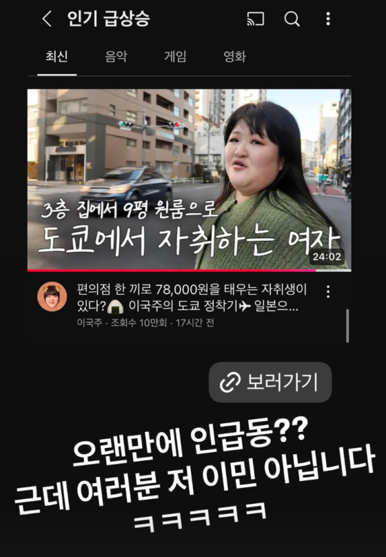 공개된 사진에는 이국주의 유튜브 채널 섬네일을 캡처한 장면이 담겼다. 여기에는 '3층 집에서 9평 원룸으로 도쿄에서 자취하는 여자'라는 설명 문구가 적혀 있다.